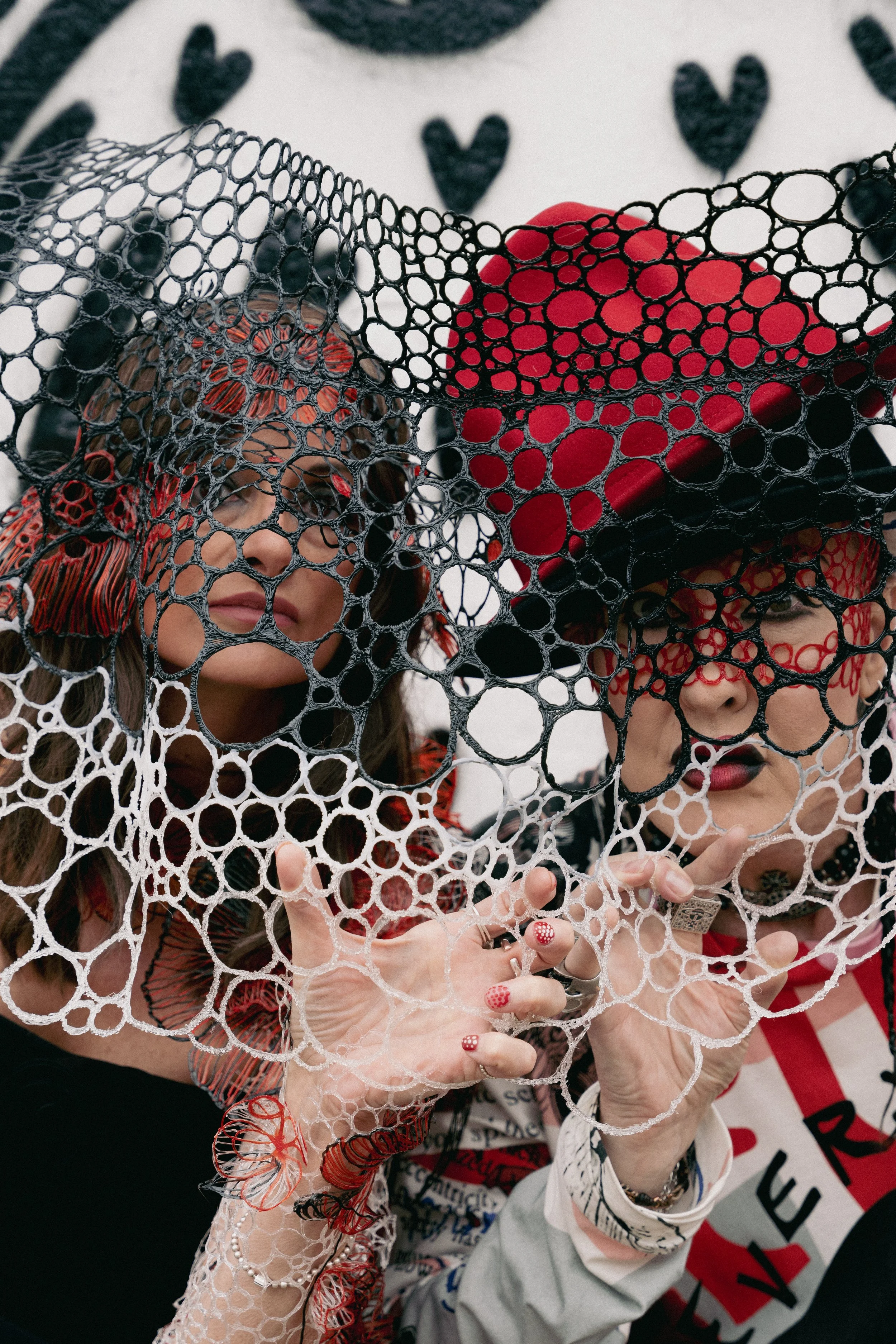 A person wearing a colorful, patchwork dress with layers of red, white, and lace fabric, and unique lace glasses, standing on a city sidewalk. View fullsize