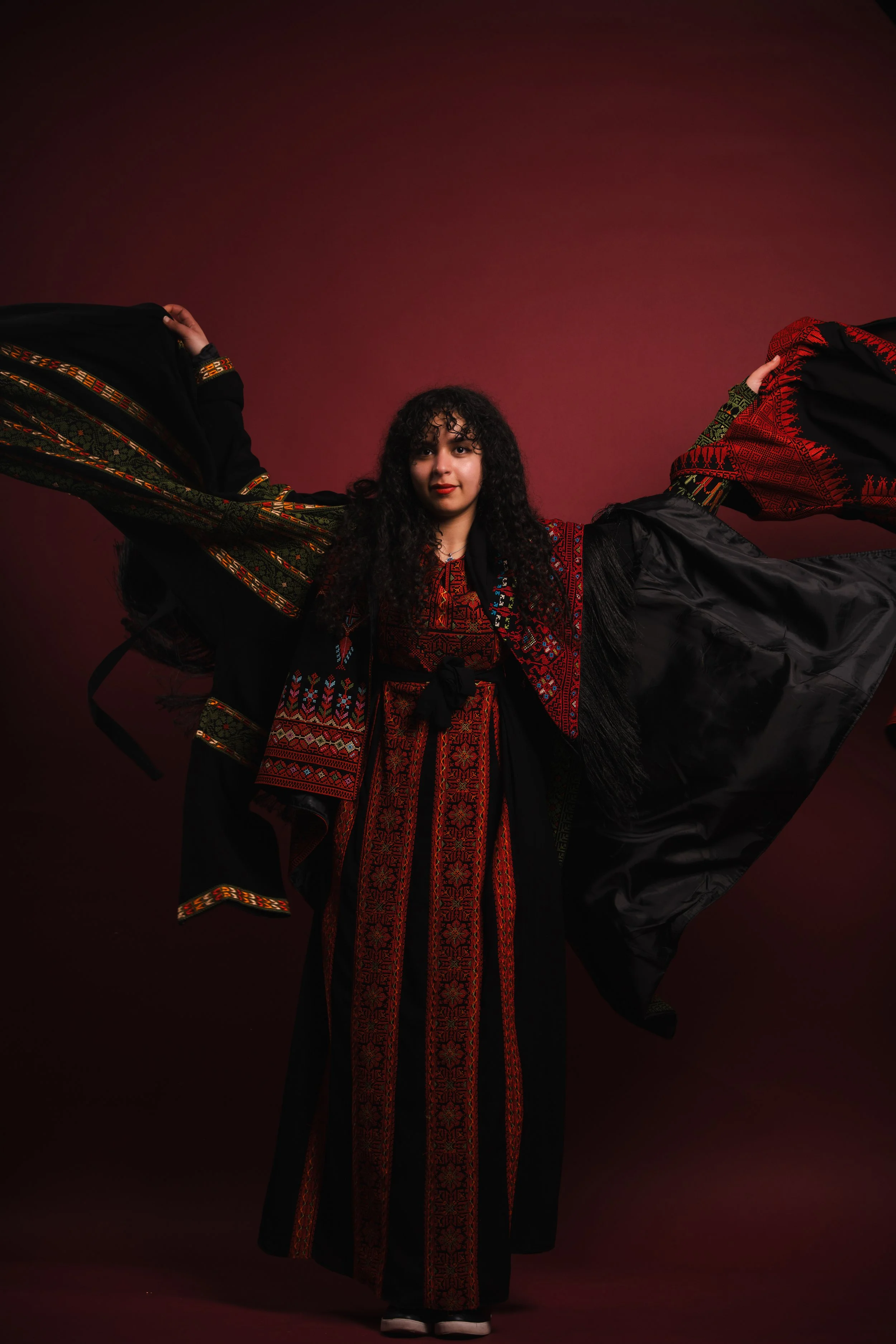 Woman in traditional and embroidered clothing standing against a dark red background with arms raised, holding a large flowing fabric. View fullsize